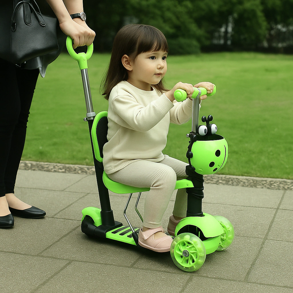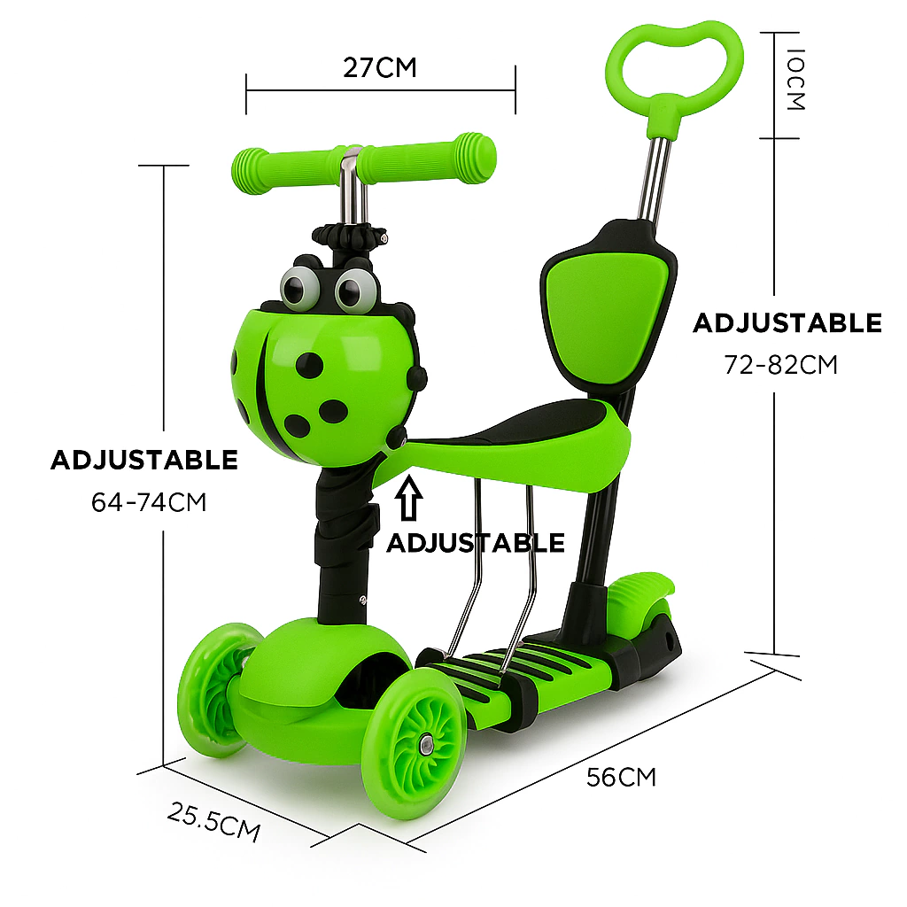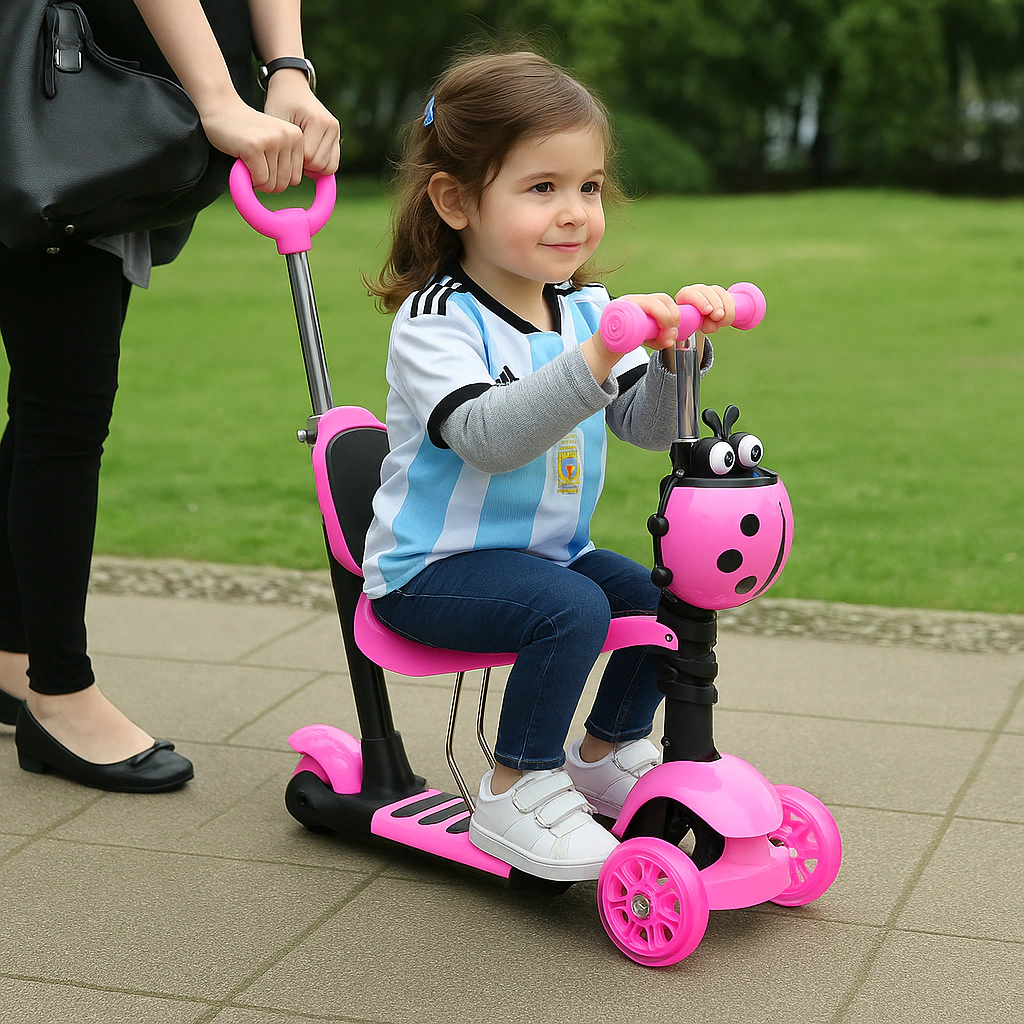 - Esta patineta se adapta a medida que tus niños crecen. El asiento se puede desmontar. Cuenta con luces LED en las llantas para más diversión cuando esta oscuro. Además su sistema de dirección la hace muy segura, hasta para los más pequeños de casa.